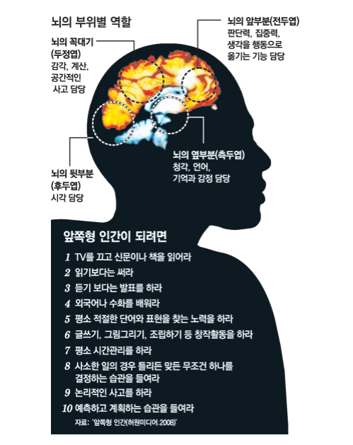 “반대로 앞쪽 뇌를 많이 활용하면 자신의 능력을 잘 파악해서 적절한 곳에 발휘하게 되므로 개인은 물론 사회 전체가 풍요로워진다”